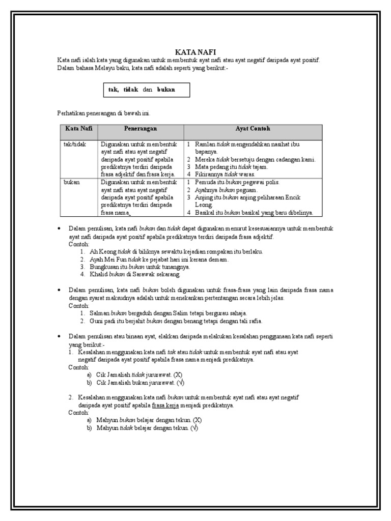 Orang tua itu tidak dari kampung kami. Kata nafi digunakan untuk menafikan sesuatu pernyataanTerdapat dua bentuk kata nafi iaitu. Lelaki yang berbaju merah itu bukan ayah saya.